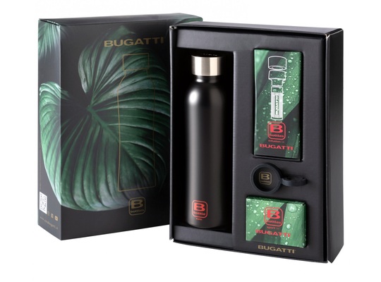 Fallegt og vönduð gjafaaskja sem inniheldur vatnsflösku, „infusion kit“ og sporttappa og griphring. Kæliflöskurnar frá Bugatti er þægilegar í hendi og gerðar úr efnum sem henta best til að halda köldu köldu og heitu heitu. Tvöfald byrði eykur enn meira eiginleika flöskurnar til að halda rétt hitastigi lengi. Heitt helst í 12klst, kalt í 24klst og ís í 36klst. Víður stútur, laust við BPA,BPS, þalat og þungamálma.